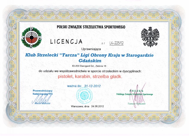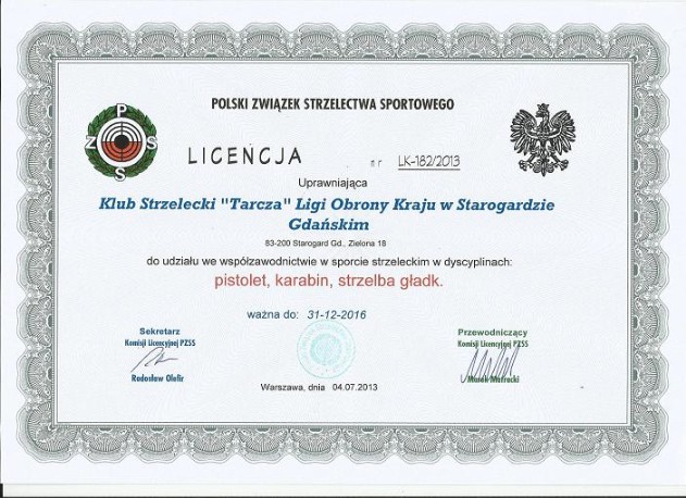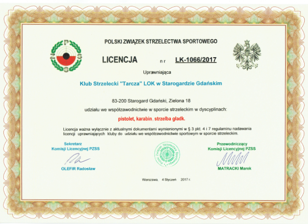 KLUB STRZELECKI " TARCZA" LOK W STAROGARDZIE GDAŃSKIM POSIADA LICENCJĘ POLSKIEGO ZWIĄZKU STRZELECTWA SPORTOWEGO W ZAKRESIE KONKURENCJI: PISTOLET, KARABIN I STRZELBA GŁADKOLUFOWA.